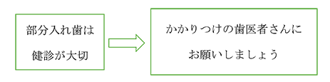 かかりつけの歯医者さんで定期的な健診をしましょう。そして部分入れ歯を大切に上手に使って健康で快適な生活をしていただきたいと思います。